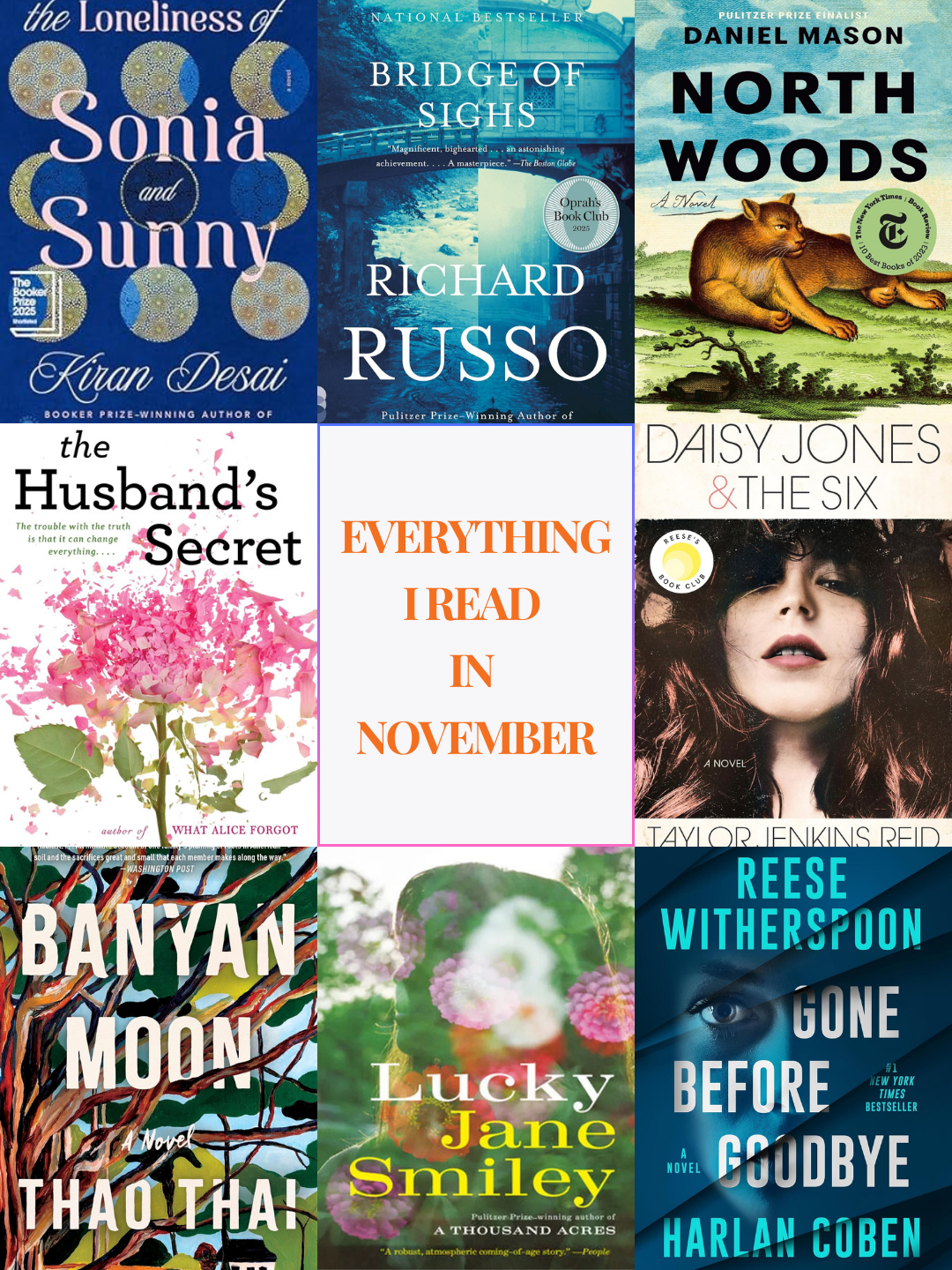 I read a ton of great books this month! Highlights: Booker-Prize shortlisted The Loneliness of Sonia and Sunny kept me company for a long time (I love big books!); North Woods, which was a fantastic trip; and the highly entertaining audiobooks of Reese Witherspoon's book and Daisy Jones and the Six. I also read Bridge of Sighs (review here), Lucky, Banyan Moon and The Husband's Secret for inspiration on my manuscript.