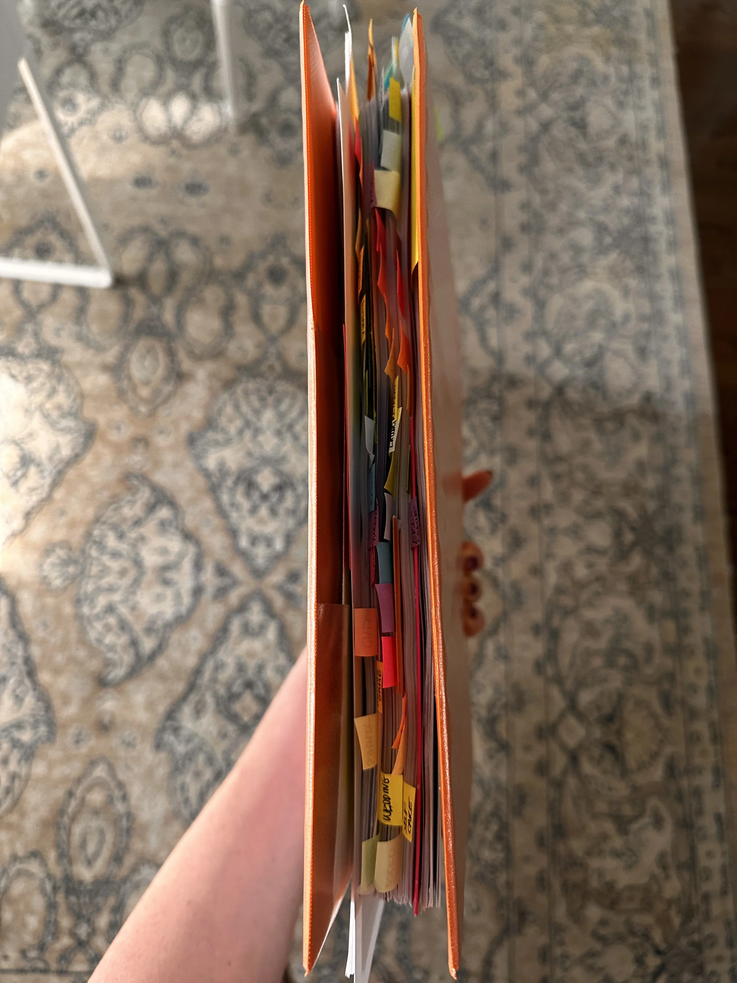 Rainbow Sticky Note Tabs (pictured everywhere): These have been a gamechanger. I use them to tab novels I’m studying (see above right). For my current manuscript revision, I printed the entire draft and used rainbow-colored tabs to organize different elements: characters, dialogue, settings, scenes to add, remove, or revise. Please see photo below: it looks like a beautiful rainbow butterfly!
